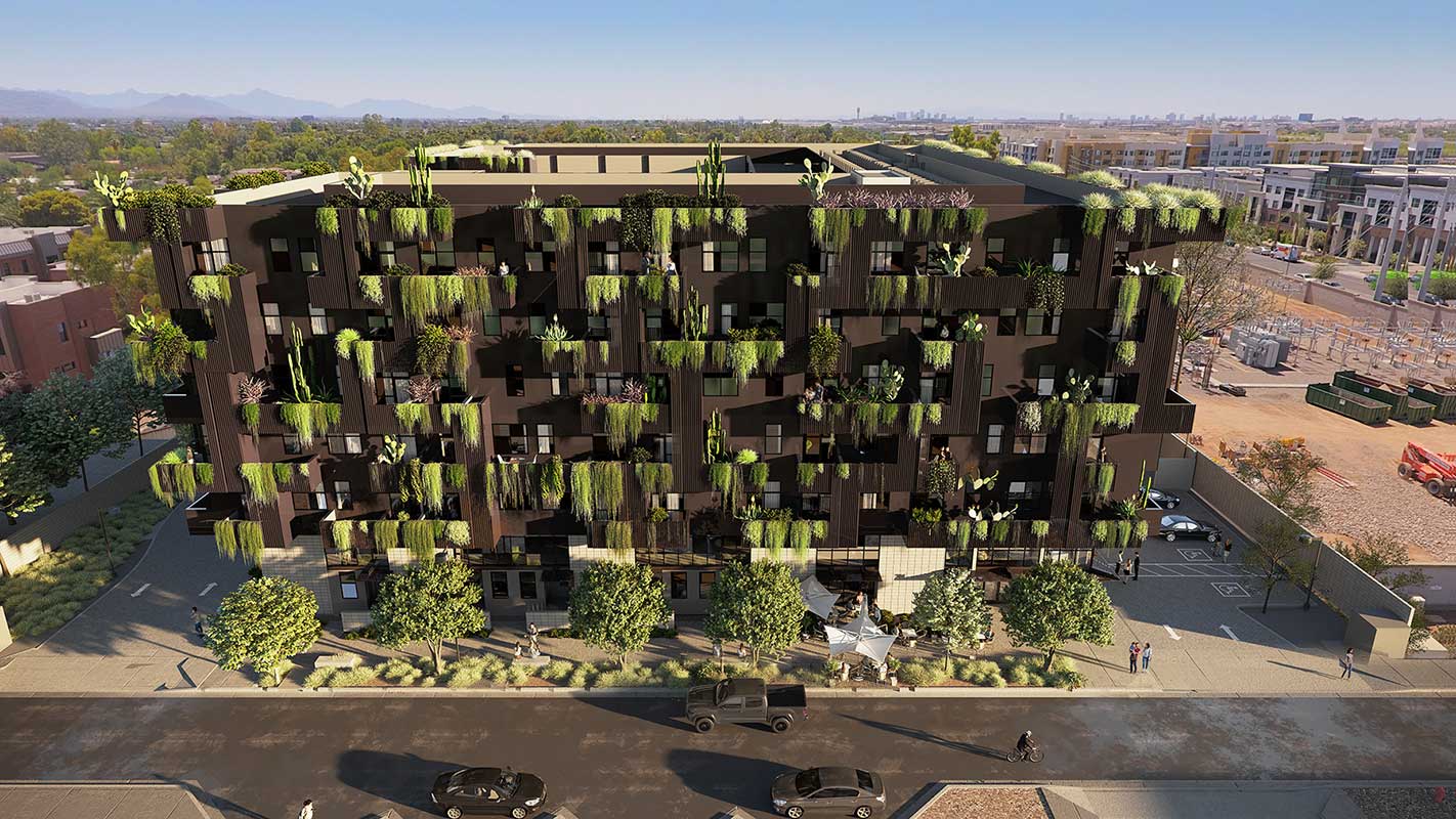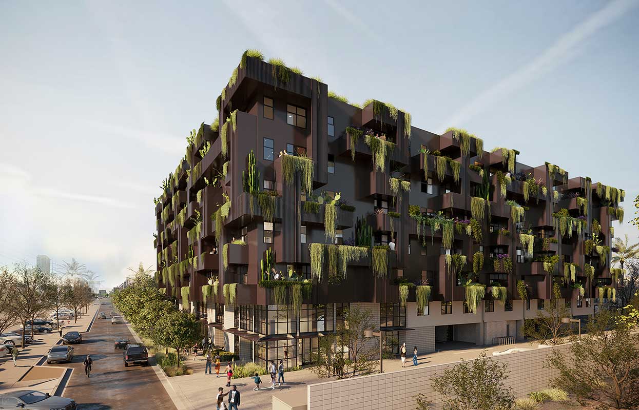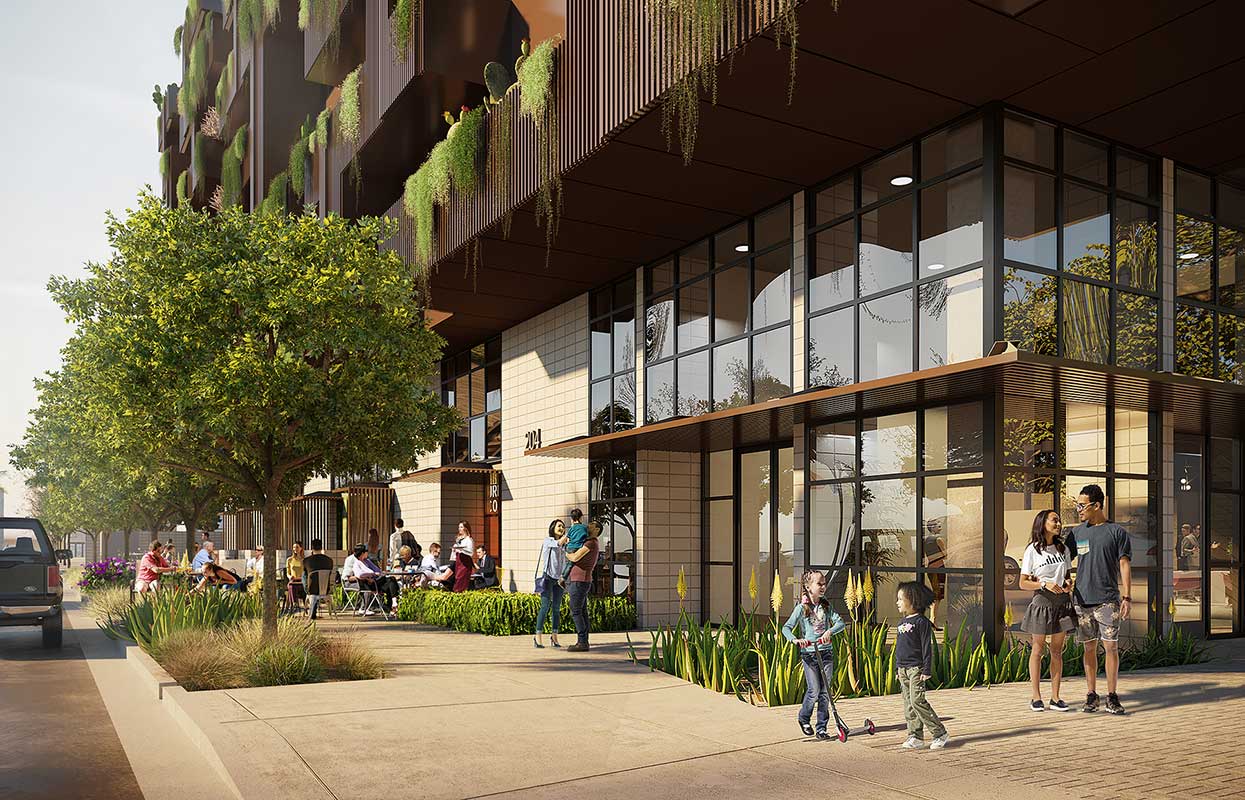 First + Farmer Residential is a sustainable mixed-use development with approximately 200 residential units, including 20 low-income housing units, with ancillary ground floor commercial in an iconic, 7-story biophilic design building.