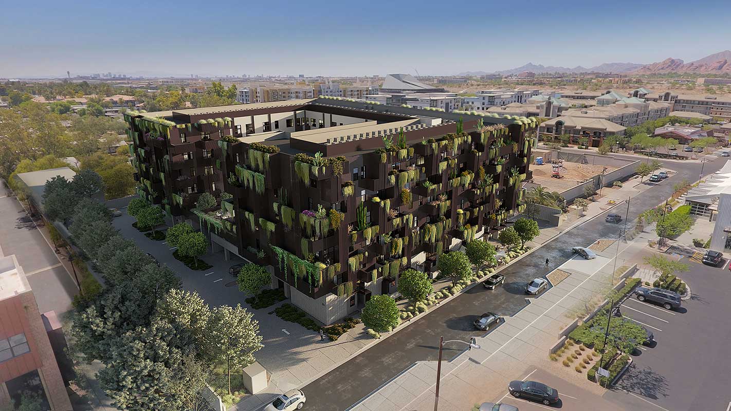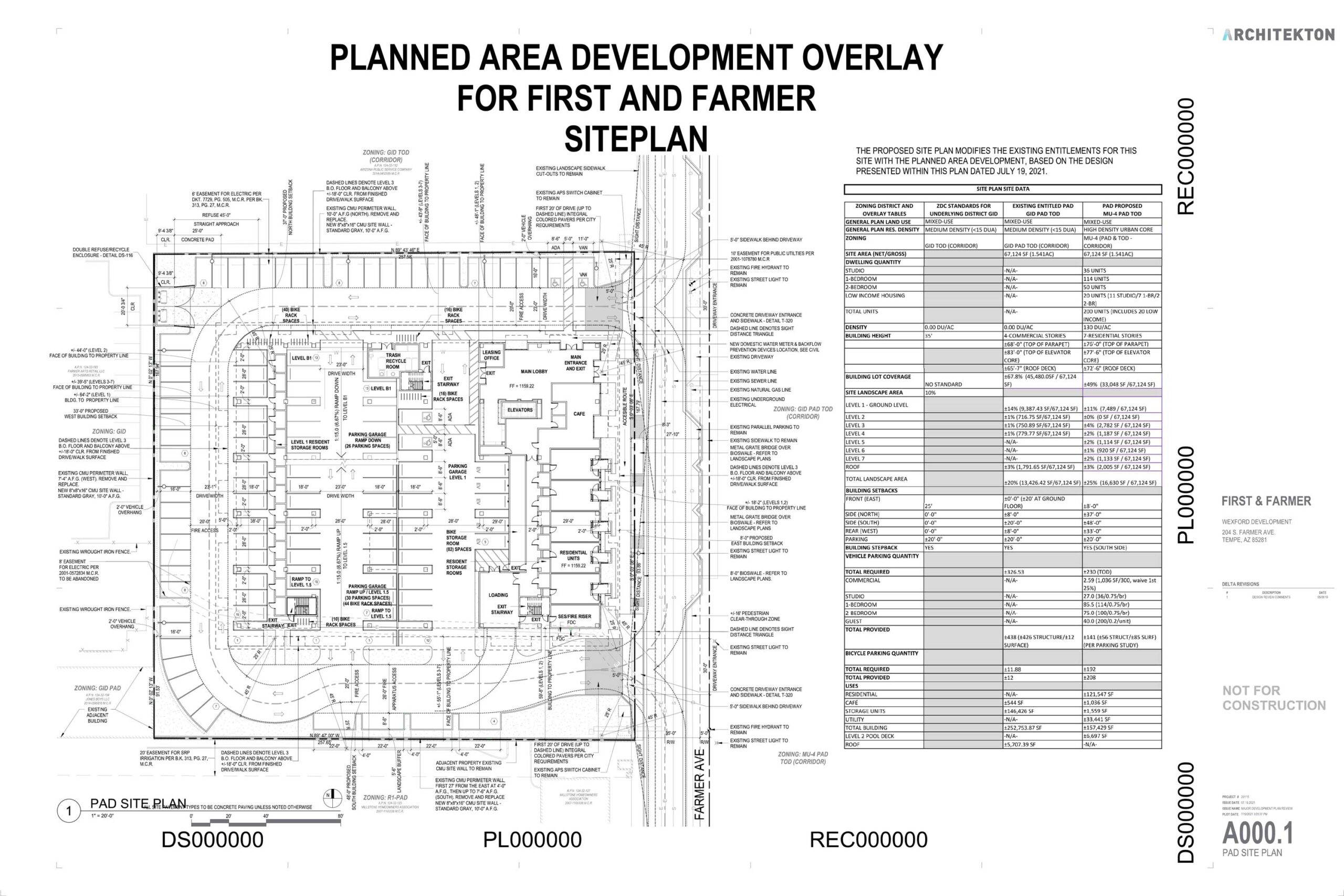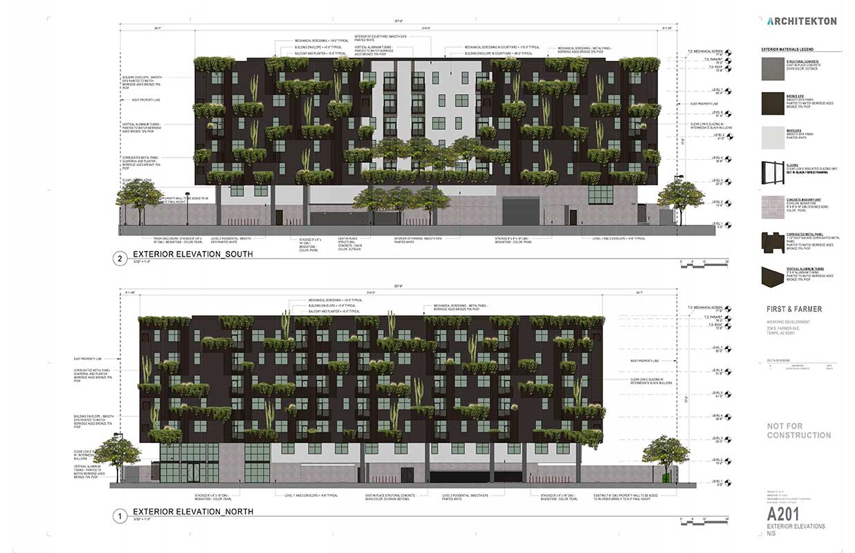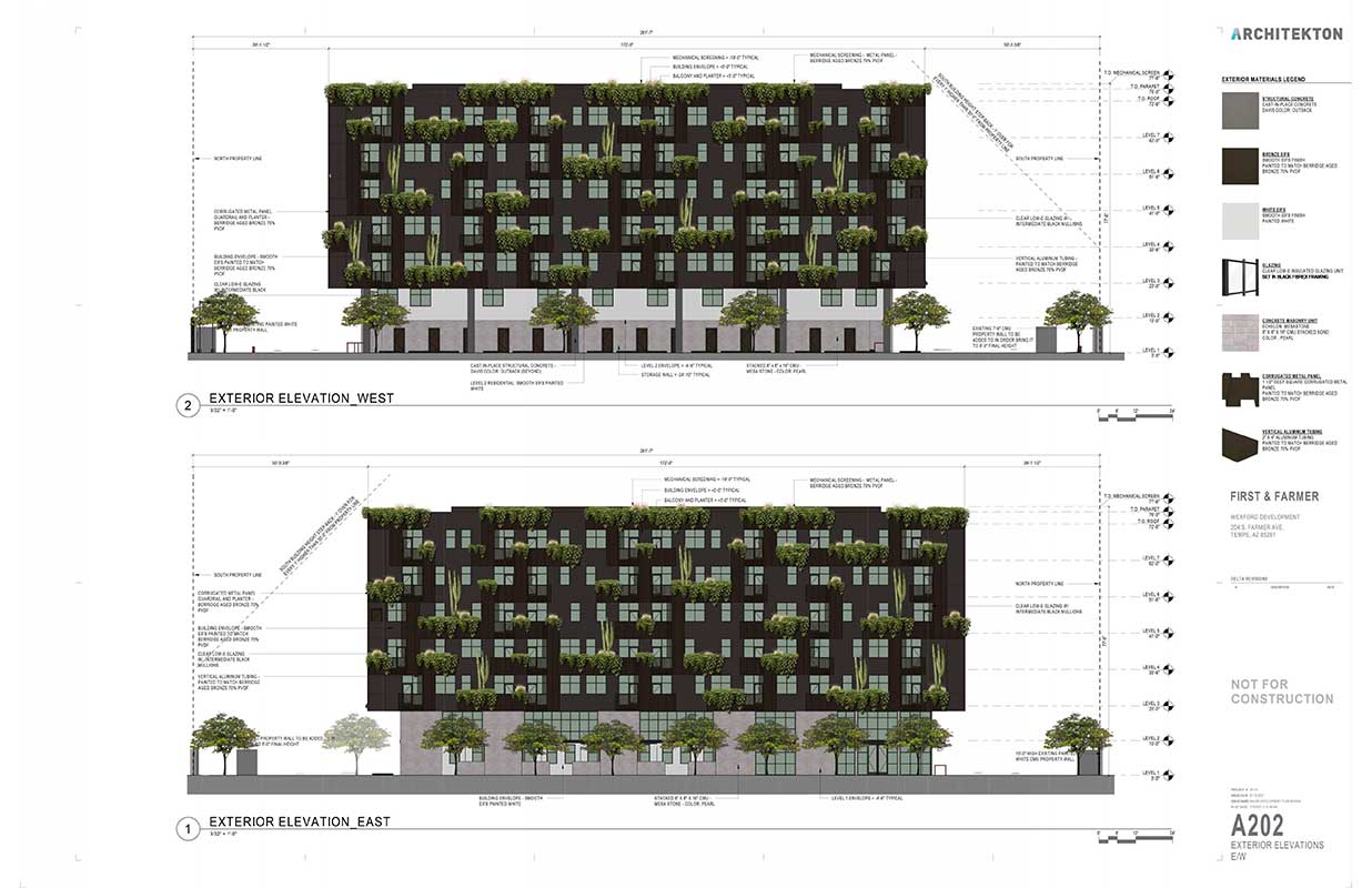 Wexford Developments is requesting the following entitlements in support of the proposed redevelopment of this underutilized industrial site: a Zoning Map Amendment from the current General Industrial (GID PAD TOD) zoning to Mixed-Use (MU-4 PAD TOD); a General Plan Amendment changing the Projected Residential Density from Medium Density (up to 15 dua) to High Density Urban Core (>65 dua); a Planned Area Development overlay amendment (PAD) to modify development standards for the existing First + Farmer PAD; and a Development Plan Review (DPR) for new building, landscape, and site plan. The proposed project is very similar to the project approved on this Site in 2019 for office use. The current request mirror’s the previously approved building design, height, and sustainability elements while transitioning the use from office to multi-family residential with 20 low-income units.
